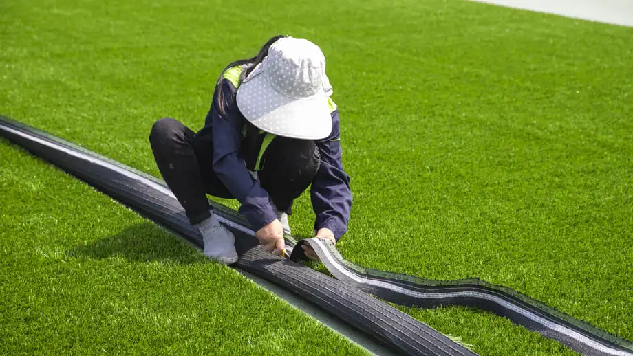 بعد وضع لفائف العشب في مكانها، يقوم الفنيون بتوصيلها باستخدام أشرطة التوصيل والمواد اللاصقة المتخصصة.